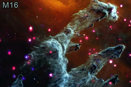 Four composite images – merging X-ray and Infrared signals – show two galaxies, a nebula, and a star cluster.