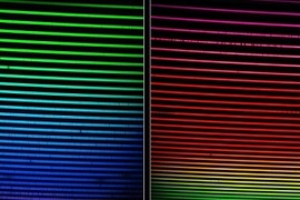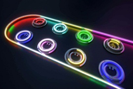A tightly-controlled 8-wavelength laser array on a silicon wafer with matched power and uniform spacing.