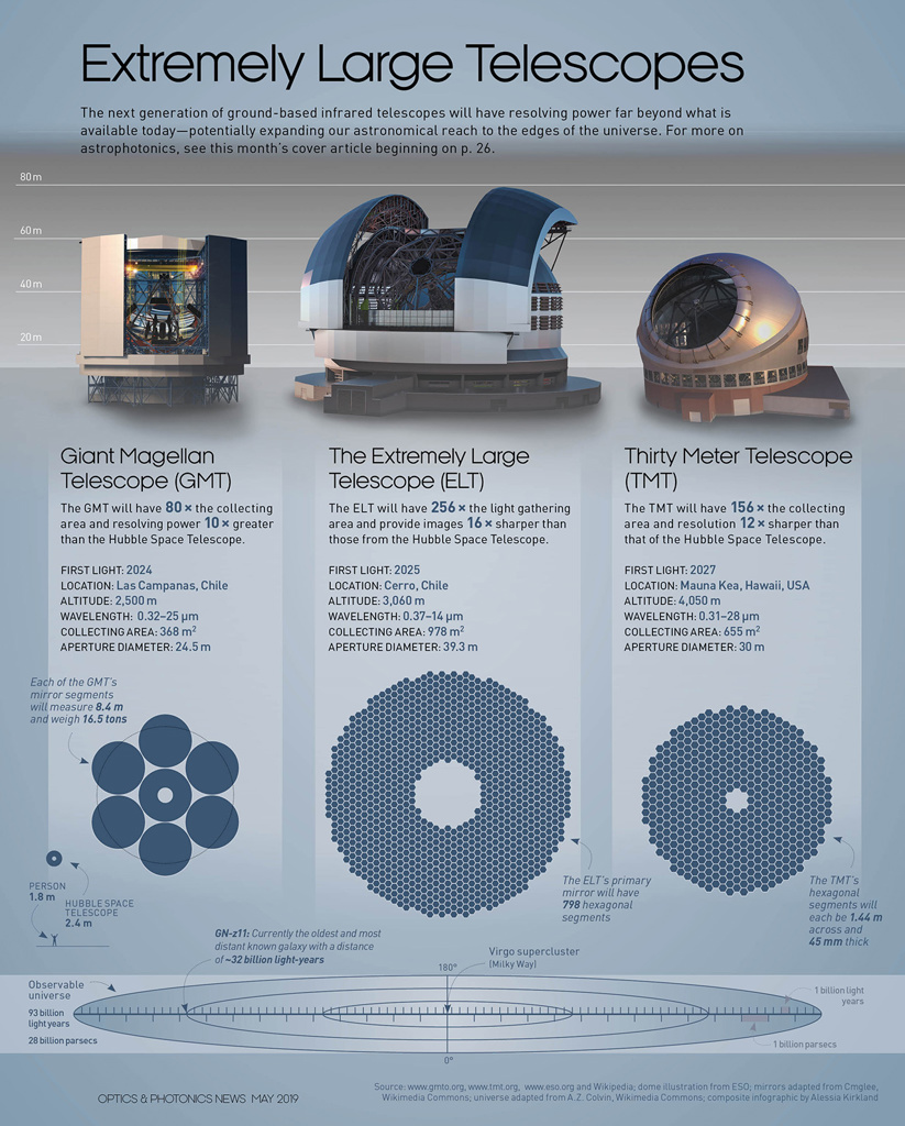 The next generation of ground-based infrared telescopes will have resolving power far beyond what is available today—potentially expanding our astronomical reach to the edges of the universe. For more on astrophotonics, see this month’s cover article Astrophotonics: The Rise of Integrated Photonics in Astronomy.