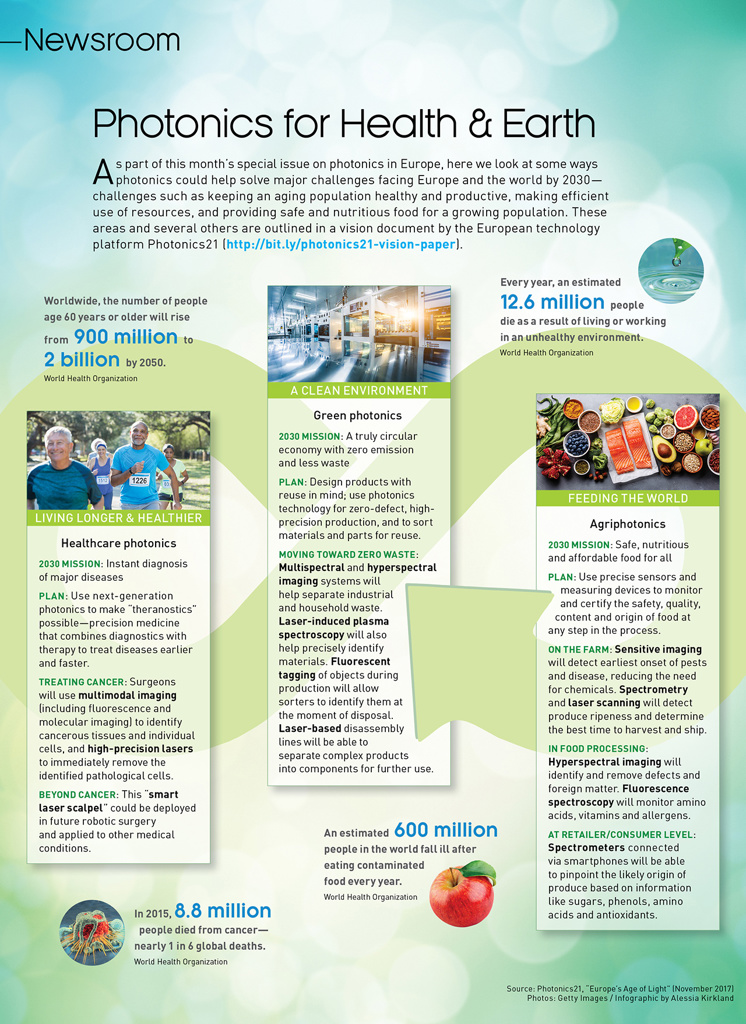 As part of this month’s special issue on photonics in Europe, here we look at some ways photonics could help solve major challenges facing Europe and the world by 2030, as outlined in a vision document by the European technology platform Photonics21.