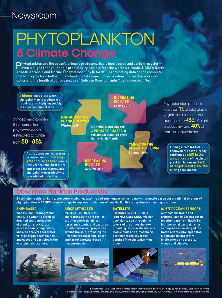 Phytoplankton are the ocean’s primary producers, basic food source and carbon recycler—even a slight change in their productivity could affect the world’s climate. NASA’s North Atlantic Aerosols and Marine Ecosystems Study (NAAMES) is collecting data on the complete plankton cycle for a better understanding of its impact on ecosystem change. For more on optics and the health of our oceans, see “Optics in Oceanography.”