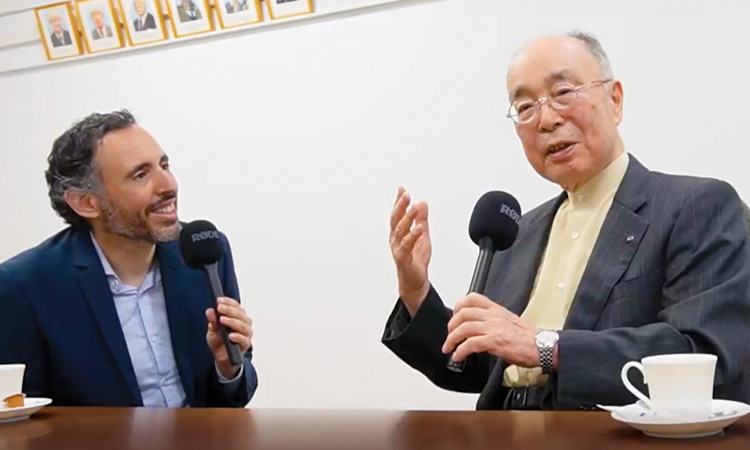 Optica CTO Jose Pozo (left) interviews Kenichi Iga at the Tokyo Institute of Technology, Japan. [Optica Archives]