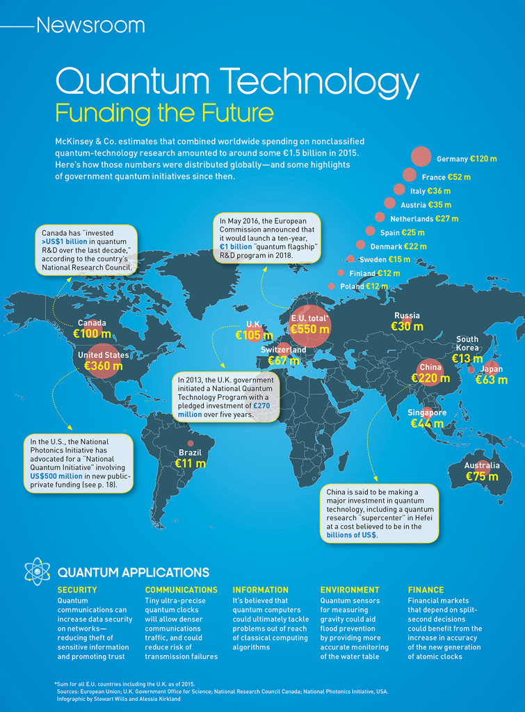 McKinsey & Co. estimates that combined worldwide spending on nonclassified quantum-technology research amounted to around some €1.5 billion in 2015. Here’s how those numbers were distributed globally—and some highlights of government quantum initiatives since then.