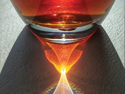 A glass of tea refracts and focuses light, acting as both a lens and a prism.