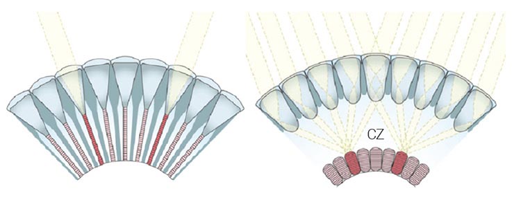 Left: In apposition eyes, ommatidia are optically isolated. The rhabdomeres—visual pigment-containing organelles of the photoreceptor cells—together form a fused rhabdom (red), which receives light through a single facet lens. Right: In superposition eyes, several lenses focus light onto a rhabdom across the clear zone (CZ). [Enlarge image]