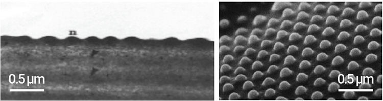 Left: Daytime predator and carrion-seeking insects have random, shallow protrusions with spectral gratings. Right: Hovering butterflies and moths have ordered, raised corneal nanostructures. [Enlarge image]