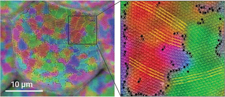 Some butterfly and moth compound eyes have lenses coated with additional raised nanostructures. Those of the Mourning Cloak butterfly (shown here) are polycrystalline with random rotational order, and defects between crystals at grain boundaries. [W.C. Smith and J.F. Butler, J. Insect Physiol. 37, 287 (1991) / D.G. Stavenga et al. Proc. R. Soc. B 273, 661 (2005) / K. Lee et al. Sci. Rep. 6, 28342 (2016), CC-BY 4.0] [Enlarge image]