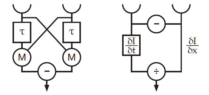 Proposed Reichardt detectors, hypothetical neural circuits postulated for insect brain motion tracking. It is thought that processing switches from (left) event signals to (right) motion signals with an increasing signal-to-noise ratio. [Enlarge image]