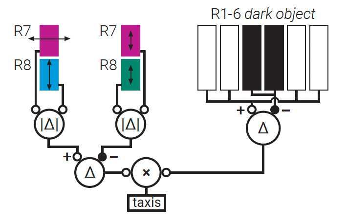 Neural circuits associated with Tabanus bromius horseflies mix polarization and intensity signals, processing input from paired polarization-sensitive detectors (R7 and R8) in orthogonal horizontal and vertical microvilli, coupled with unpolarized signals from other photoreceptors (R1 to R6). [T. Haslwanter, Wikimedia Commons, CC-BY-SA 3.0 / A. Meglič et al. Proc. Natl. Acad. Sci. USA 116, 21843 (2019), CC-BY-NC-ND 4.0] [Enlarge image]