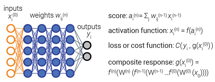 Schematic view of a dense, fully connected multilayer neural network used for image processing in which inputs are transformed to outputs via a learned model. [Enlarge image]