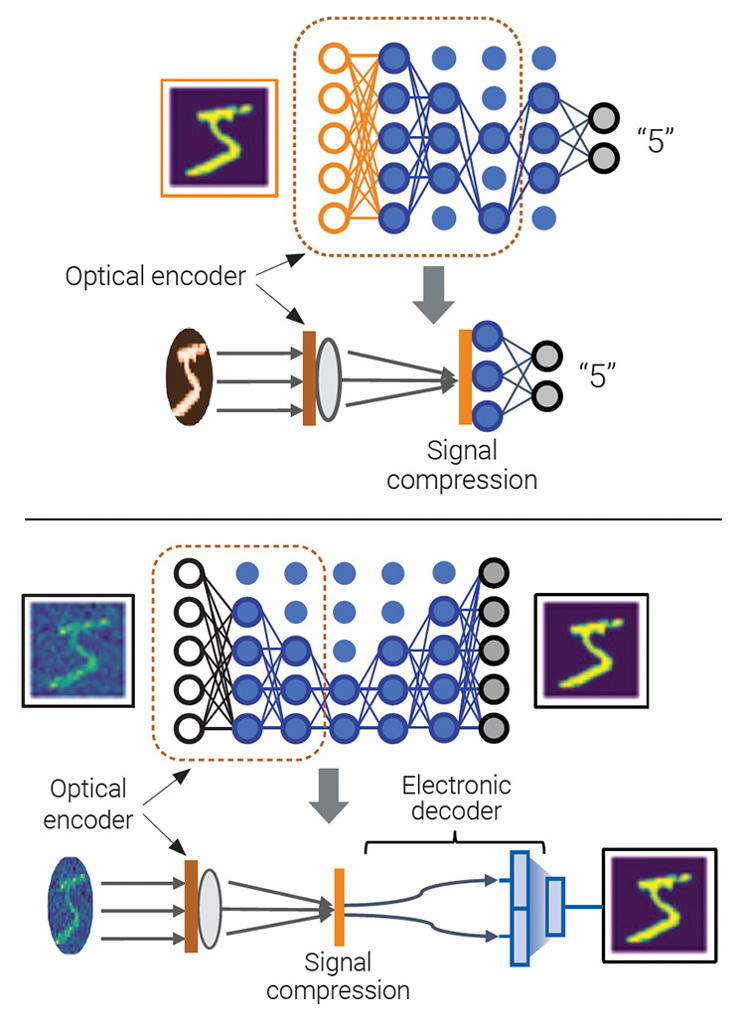 Preprocessing with optical encoders can provide spatial signal compression to minimize the model size, either for detecting features, for example for image classification (center), or for filtering noise, for example for image reconstruction (bottom). In both cases, the optical preprocessing results in a smaller model with reduced computational load. [Enlarge image]