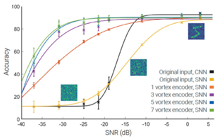 A single-layer neural network (SNN) with additional optical preprocessing (in the form of a vortex lens encoder) enabled the robust classification of MNIST handwritten digits. At low noise levels (high SNR), classification accuracies are comparable to deep-learning convolutional neural networks (CNNs). At high noise levels (low SNR), the SNN with vortex encoders significantly outperforms the CNNs. Insets show noisy images without encoding. [B. Muminov and L.T. Vuong, Proc. SPIE 11388 (2020), doi: 10.1117/12.2558983] [Enlarge image]