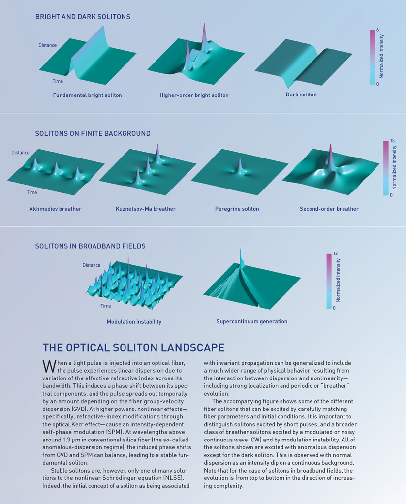 The success of those experiments, however, launched a revolution. Indeed, in the half-century since Hasegawa and Tappert predicted that temporally localized solitons could be generated in optical fiber, temporal soliton physics has come to underpin not just key communications studies, but many areas of ultrafast photonics including laser design, frequency-comb generation, and interdisciplinary studies related to complexity and rogue waves. Here, in celebration of the 50th anniversary of Hasegawa and Tappert’s pioneering work, we look at the big impact of these tiny, solitary optical pulses.