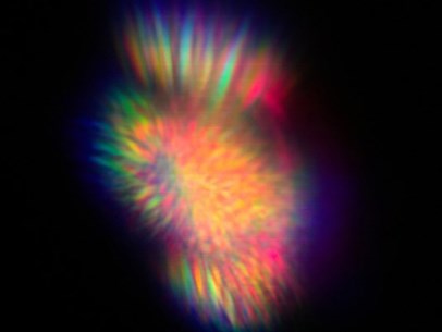 A focused femtosecond laser pulse interacts with a glass slide—creating a colorful flying-bird pattern. The shiny colors denote the strong laser-induced breakdown.