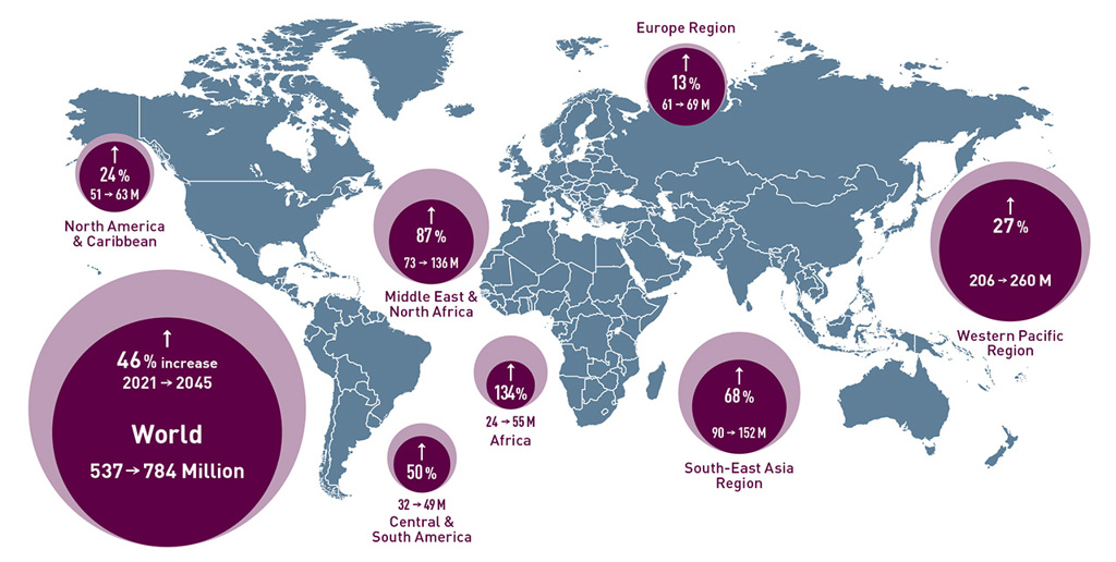 Diabetes around the world: According to the International Diabetes Federation, an estimated 537 million—or one in ten—adults aged 20–79 are living with diabetes worldwide. The number is predicted to rise to 784 million by 2045. [Enlarge graphic] [Source: International Diabetes Federation, 2021 Diabetes Atlas]