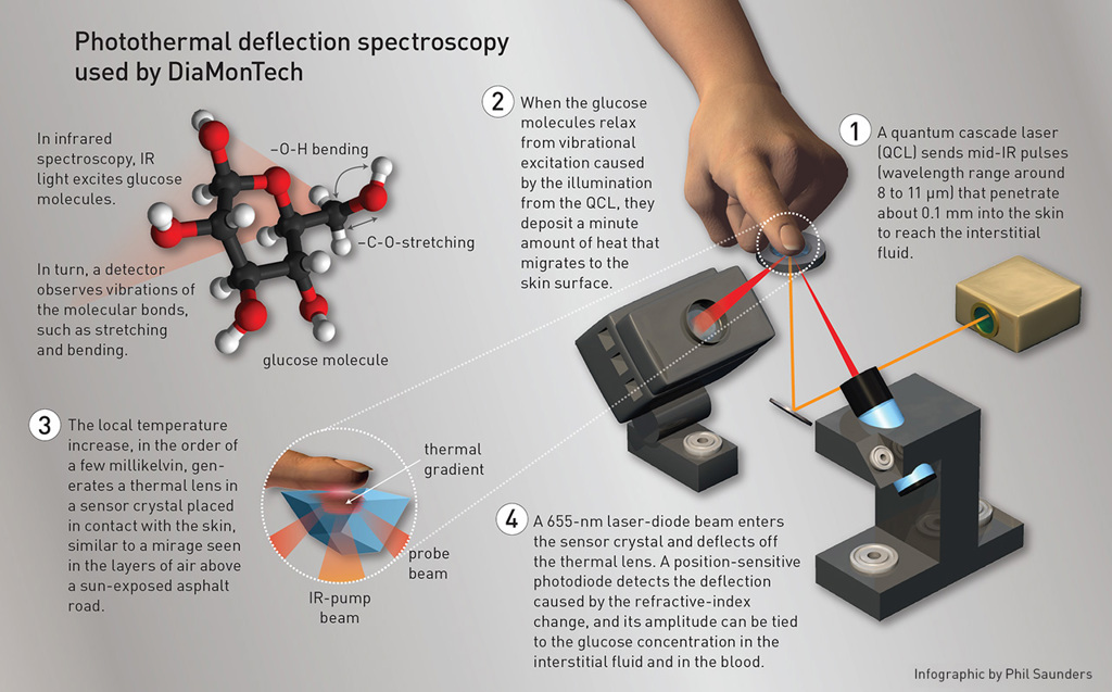 “In our view, the many attempts to use optical techniques failed because, for the sake of simplicity, NIR wavelengths were used. [One reason is that] NIR can detect glucose overtones, but overtones are around 10 to 100 times weaker than the mid-IR fundamental modes,” said Mäntele, chief scientific officer at DiaMonTech, whose company name is a portmanteau of “diabetes monitoring technology.” “NIR thus will not solve the problem, nor lead to the ‘holy grail’ of noninvasive glucose monitoring.”
