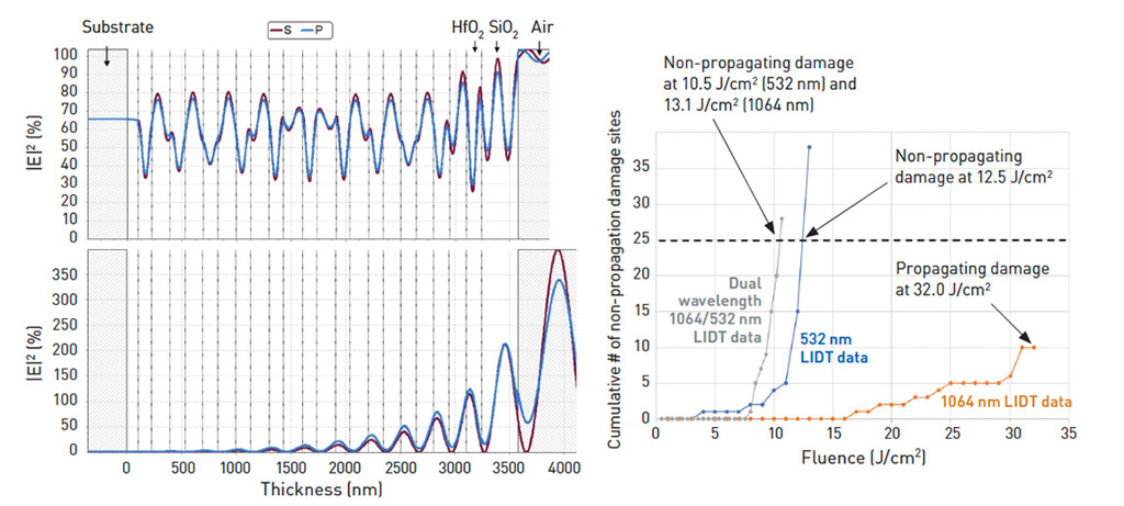 Electric-field standing-wave intensity models (S and P polarizations) at 532 nm (top left) and 1064 nm (bottom left) for a HfO2/SiO2 dichroic coating design, assuming an incidence angle of 22.5°. Vertical lines show layer interfaces. Right: Results of laser-damage tests in the ns-pulse regime on the designed coating as deposited highlight LIDTs that are higher for 1064-nm compared with 532-nm laser radiation, and still lower for 1064/532-nm dual-wavelength laser radiation. [Enlarge image] [E.S. Field et al., Proc. SPIE 11173, 1117314 (2019); reprinted with permission]