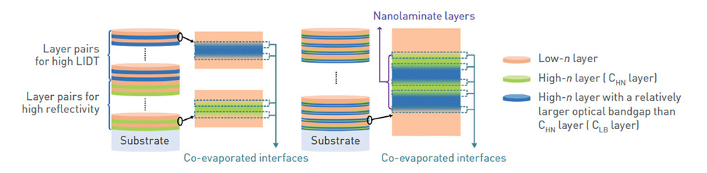 Mirror coatings with layer interfaces co-evaporated from adjacent layer materials. In traditional approaches (left), low-index (Low-n) layers alternate with high-index layers (inner CHN layers and outer, larger-band-gap CLB layers). In nanolaminate approaches (right), low-index layers alternate throughout the coating with nanolaminate high-index layers comprised of alternating CHN and CLB nanolayers, providing improved optical performance and laser-damage resistance over traditional approaches. [Enlarge image] [M. Zhu et al., Light Sci. Appl. 9, 20 (2020); CC-BY 4.0]