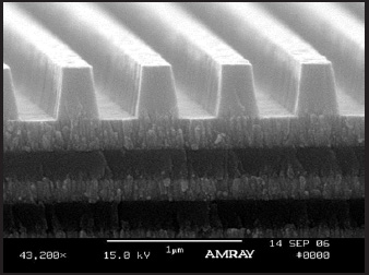 SEM image of the groove structure in the outer SiO2 layer for a PGL MLD grating. Such gratings provide a typical LIDT of 2.5 J/cm2 for 10-ps and longer pulses. [Courtesy of PGL]