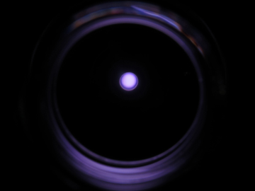 The glow of a Th-Ar hollow-cathode lamp. Reflection of light can be seen at the glass walls of the confining cylinder. Image taken with a Canon EOS 450.