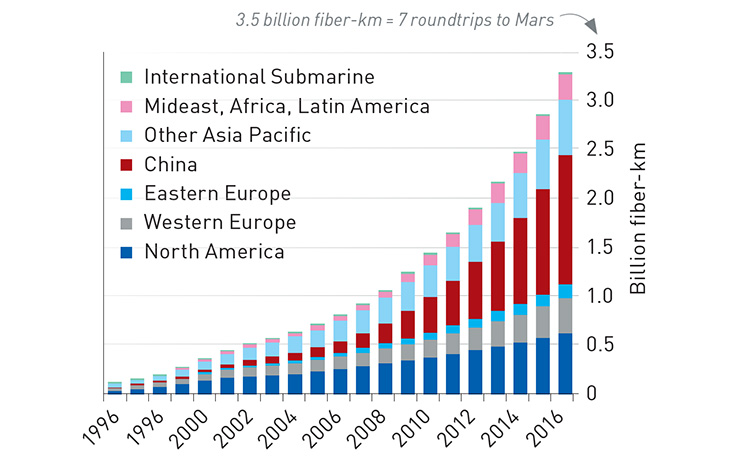 Cumulative total of cabled fiber installed worldwide. [Enlarge graph] [P. Schultz, from Optica webinar based on CRU data]