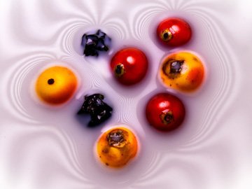 Striped pattern reflected in surface of milk with a few wild berries.