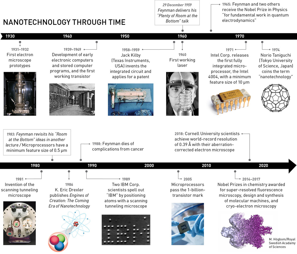 Although, in hindsight, Feynman has been credited with sparking interest in nanotechnology, historians of science generally say that the field started in the 1980s and 1990s and retroactively appropriated the Nobel laureate’s musings as a stamp of authenticity. Molecular-machinery advocate K. Eric Drexler took the concepts of Feynman’s talk and expanded on the notion of self-replicating nanorobots in his 1986 book Engines of Creation: The Coming Era of Nanotechnology. Between that book and Feynman’s death, the 1959 lecture, which had been little cited, found a new audience.