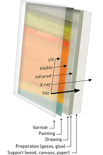 Cross-section of a typical painting, showing the penetration of different types of electromagnetic radiation. Terahertz rays travel farther into the layers than shorter frequencies of light. Although X-rays penetrate artifacts to greater depths, care must be taken with this ionizing radiation.