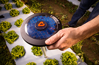 Wolf has set up a company, Arable, that markets a disk-shaped mountable device housing multiple sensors and linked to cloud-based analysis. The idea, he says, is to give farmers more understandable, usable information on the timing, yield and quality of harvests. Silicon photodiodes measure incoming visible radiation, which reveals both the energy available for photosynthesis and the amount of energy plants dissipate through evaporation. By combining that information with data from a spectrometer, which measures the tiny amount of energy actually used for photosynthesis, the setup reveals how efficiently plants produce biomass.