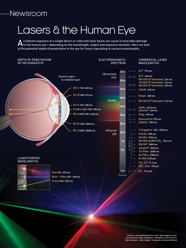 Accidental exposure to a single direct or reflected laser beam can cause irreversible damage to the human eye—depending on the wavelength, output and exposure duration.