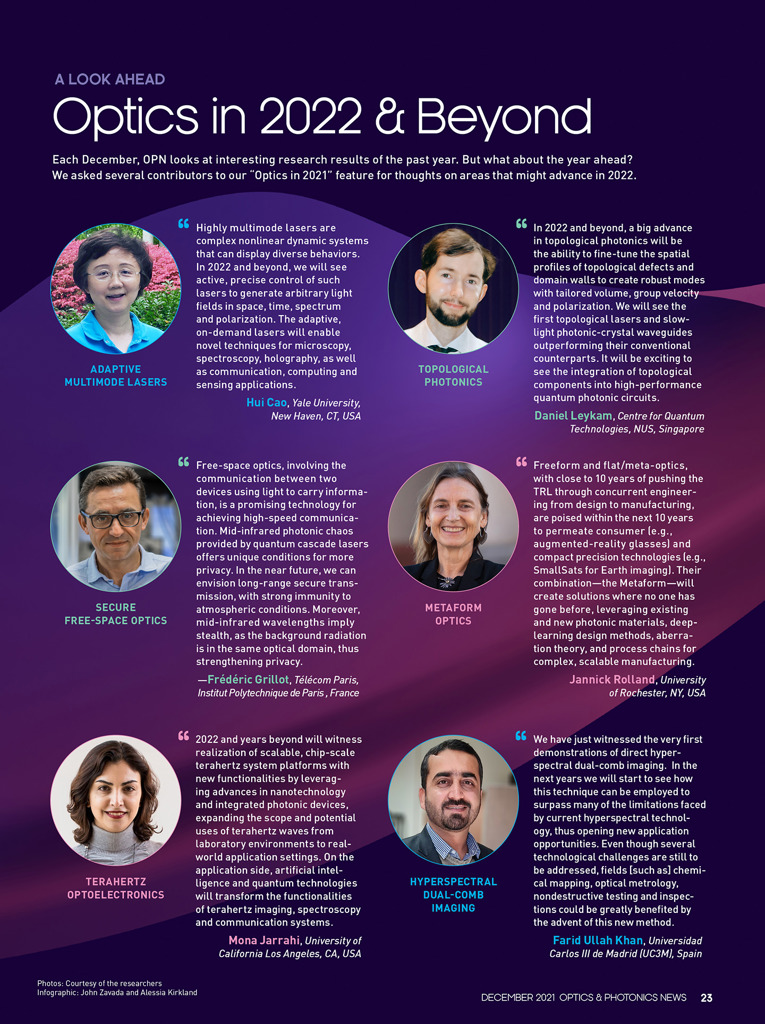 Each December, OPN looks at interesting research results of the past year. But what about the year ahead? We asked several contributors to our “Optics in 2021” feature for thoughts on areas that might advance in 2022.