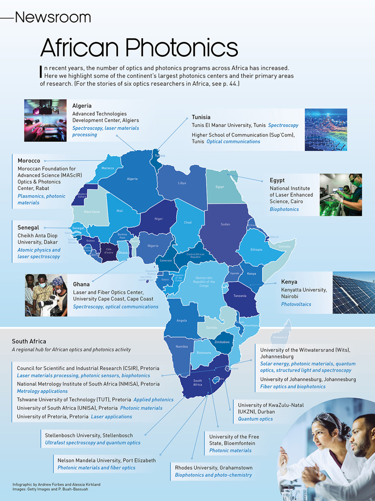 In recent years, the number of optics and photonics programs across Africa has increased. Here we highlight some of the continent’s largest photonics centers and their primary areas of research.