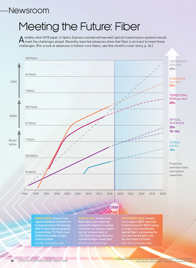 A widely cited 2018 paper in Optics Express considered how well optical transmission systems would meet the challenges ahead. Recently reported advances show that fiber is on track to meet those challenges. (For a look at advances in hollow-core fibers, see this month’s cover story.)