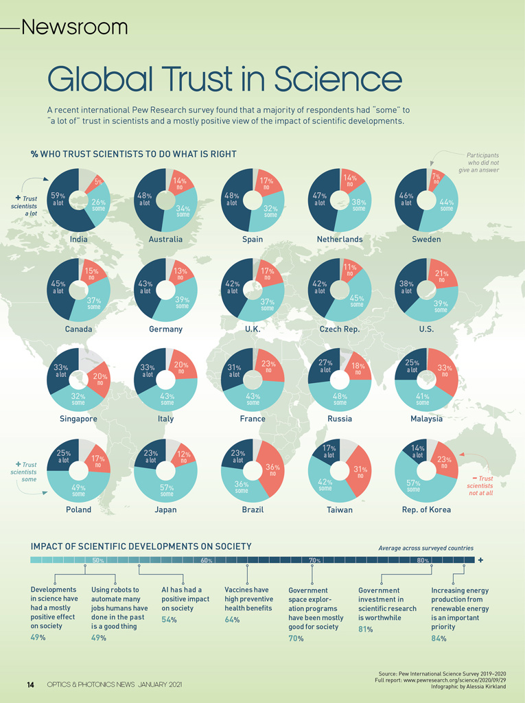 A recent international Pew Research survey found that a majority of respondents had “some” to “a lot of” trust in scientists and a mostly positive view of the impact of scientific developments.