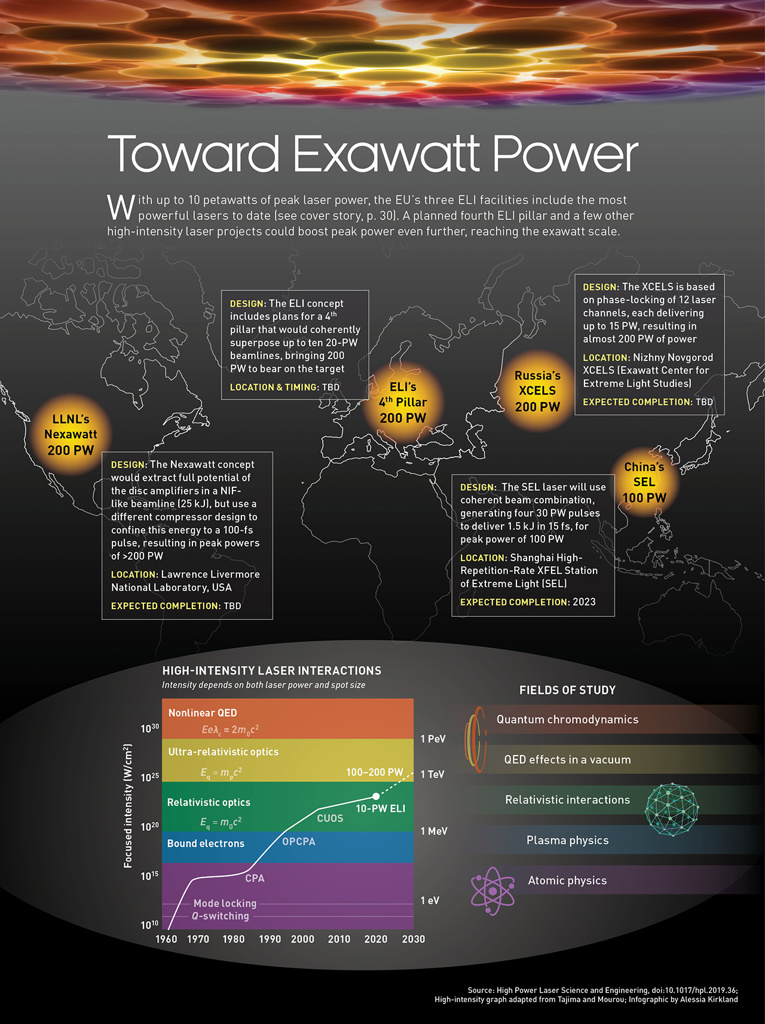 With up to 10 petawatts of peak laser power, the EU's three ELI facilities include the most powerful lasers to date (see this month's cover story ELI: Open for Business). A planned fourth ELI pillar and a few other high-intesity laser projects could boost peak power even further, reaching the exawatt scale.