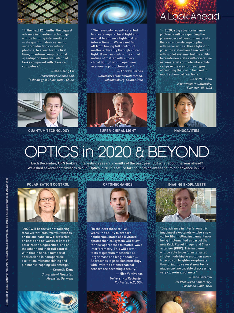Each December, OPN looks at interesting research results of the past year. But what about the year ahead? We asked several contributors to our "Optics in 2019" feature for thoughts on areas that might advance in 2020.