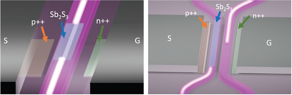 We recently demonstrated a wide-bandgap, PCM antimony sulfide (Sb2S3)-clad silicon photonic platform that simultaneously achieves losses of less than 1.0 dB, extinction ratios greater than 10 dB, high cyclability (more than 1,600 switching events) and, most importantly, 5-bit operation.4 Our team was able to program these Sb2S3-based devices, including phase shifters and directional couplers, within sub-ms timescales via on-chip silicon PIN diode heaters.