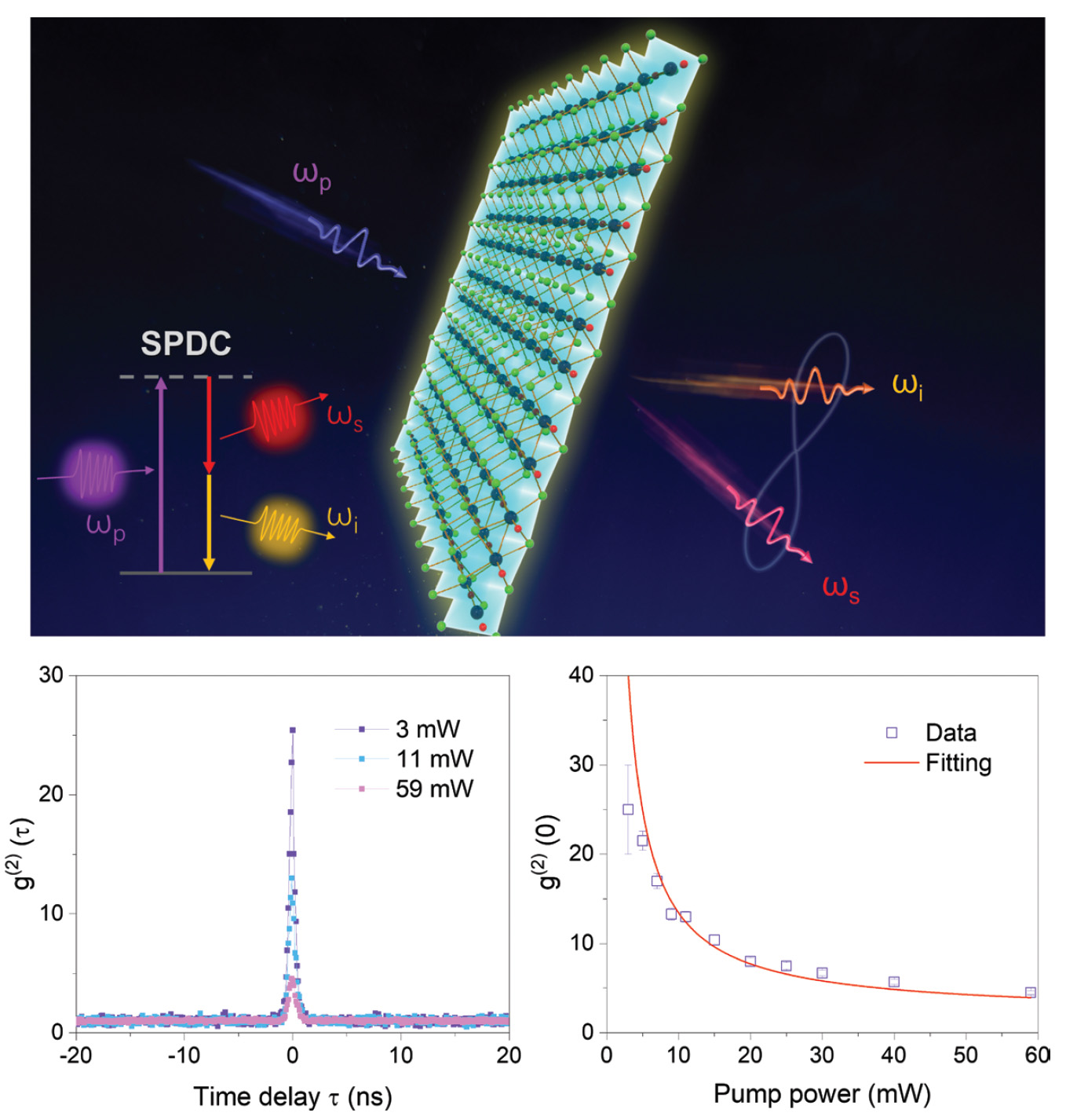 [Enlarge image]Top: Artist's view of the SPDC process with a van der Waals crystal. Bottom left: Measured two-photon temporal correlation functions at different pump powers. Bottom right: Pump-power-dependent normalized correlation function at zero-time delay.