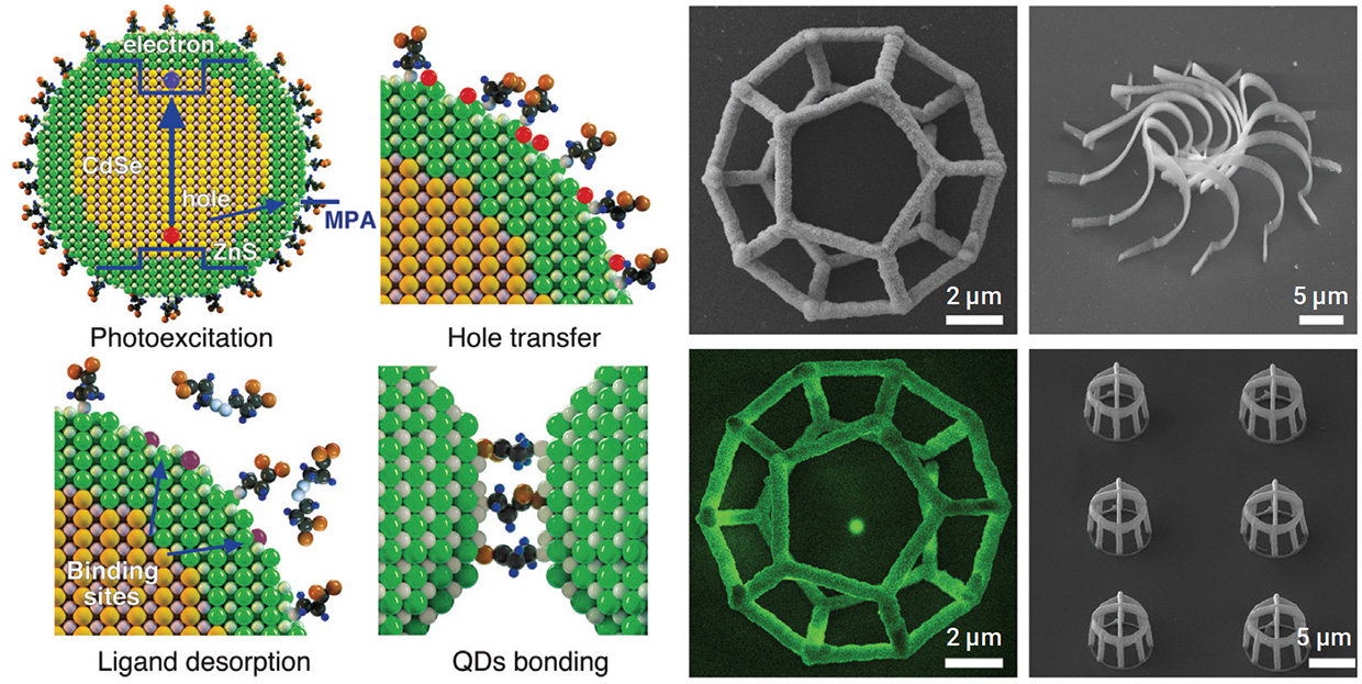 In recent work, we developed a polymer-free 3D-printing technique called photoexcitation-induced chemical bonding (PEB) to directly assemble and print colloidal nanocrystals into 3D nanostructures.2 Colloidal nanocrystals are solution-grown, nanometer-sized inorganic particles that present an ideal candidate for the functional feedstocks, thanks to their abundant species and superior properties.3,4