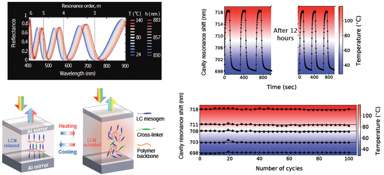 By thermally inducing mechanical adaptations in the nematic polymer network, we can reversibly change the resonant reflectance of these Al–LCN–Al optical cavities. The tuning mechanism exploits fully reversible temperature-induced mechanical shape adaptations in the cross-linked polymer network.4,5 We demonstrated reversible and linear dynamic tuning of the resonant wavelength over 150 cycles of thermo-mechanical actuation and relaxation. We also showed control over optical resonances with sub-nanometer precision over 100 cycles.