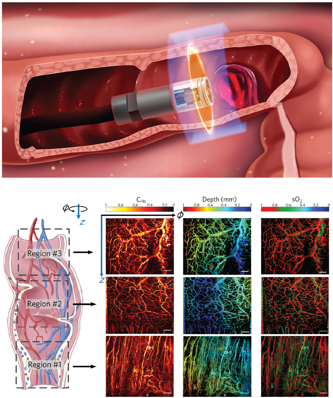 [Enlarge image]Top: Schematic of the photoacoustic fiberscope for gastrointestinal endoscopic imaging. Bottom: In vivo imaging results of the hemoglobin concentration (CHb), depth and oxygen saturation (sO2) in three different regions of a rat rectum.