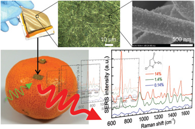 [Enlarge image]Top: Schematic of the flexible gold nanomesh substrate. Bottom: Place & Play SERS measurement scheme, involving the placement of the gold nanomesh substrate on an object of interest for conducting in situ measurements.