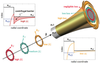 In work published this year,1 we demonstrated that cutoff modes carrying sufficiently high orbital angular momentum (OAM) are naturally resistant to perturbations and have low losses (theoretical confinement losses of ~10–5 dB/km). As an unbound mode’s OAM increases, its transverse wavevector becomes increasingly azimuthally oriented, implying that these cutoff modes are indeed trying to “escape” the waveguide, but those with high OAM simply keep circulating around it, effectively possessing low propagation losses. More rigorously stated, the refractive-index profile of a cylindrically symmetric potential such as an optical fiber is effectively modulated by the angular momentum of the photon.