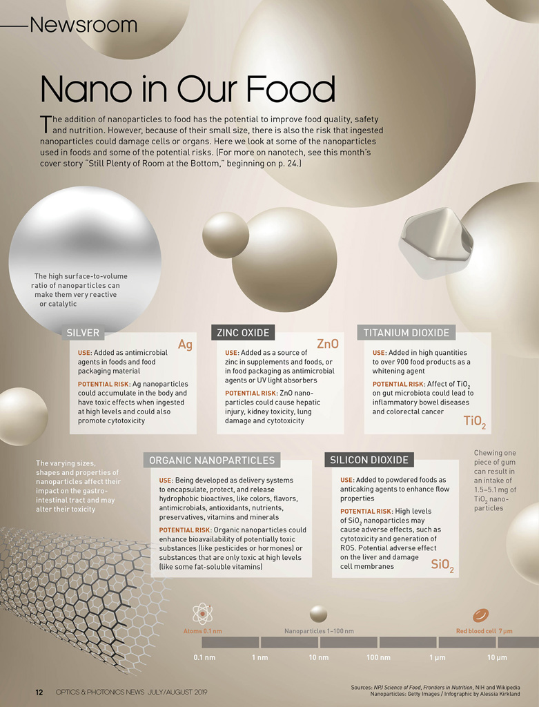 The addition of nanoparticles to food has the potential to improve food quality, safety and nutrition. However, because of their small size, there is also the risk that ingested nanoparticles could damage cells or organs. Here we look at some of the nanoparticles used in foods and some of the potential risks. (For more on nanotech, see this month’s cover story “Still Plenty of Room at the Bottom.”)