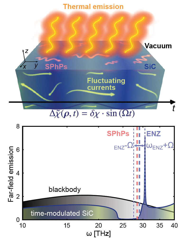 [Enlarge image]Top: Conceptual illustration of the thermal radiation emanating from a time-modulated planar slab. Bottom: Emission spectrum of SiC under a time-harmonic modulation at frequency Ω.