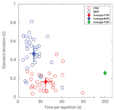 [Enlarge image]Standard deviation versus time per repetition for flicker-minimization (FRR, red), blur-minimization (BRR, blue), and traditional subjective refraction (TSR, green).