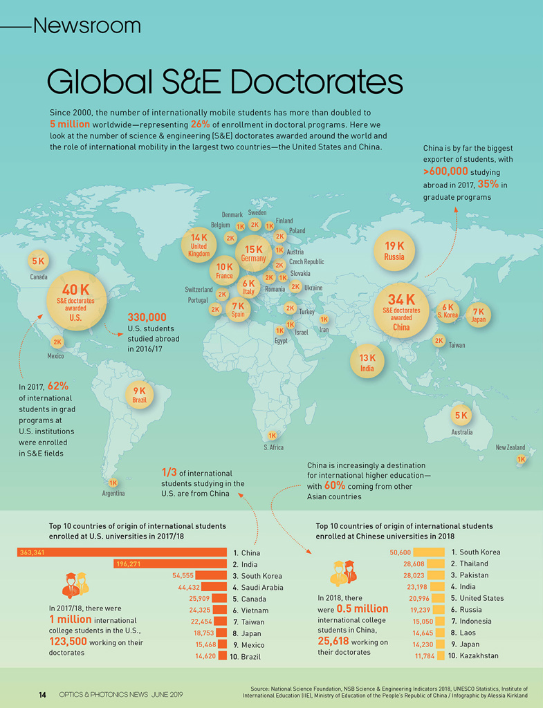 Since 2000, the number of internationally mobile students has more than doubled to 5 million worldwide—representing 26% of enrollment in doctoral programs. Here we look at the number of science & engineering (S&E) doctorates awarded around the world and the role of international mobility in the largest two countries—the United States and China.
